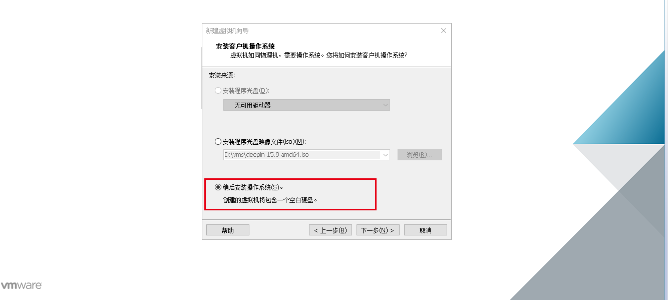 3. 选择稍后安装操作系统,或着选择安装程序光盘映像文件(ISO)