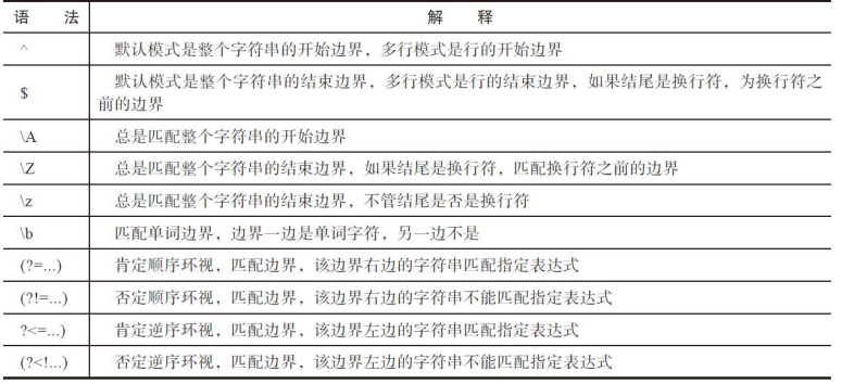 常用的表示特殊边界的元字符有:^(字符组外匹配字符串的开始,多行匹配模式中匹配行的开始)$(匹配字符串的结束,多行匹配模式中匹配行的结束)\A (匹配字符串的开始边界)\Z(匹配字符串的结束边界)\z(匹配字符串的结束边界)\b(匹配单词的边界)